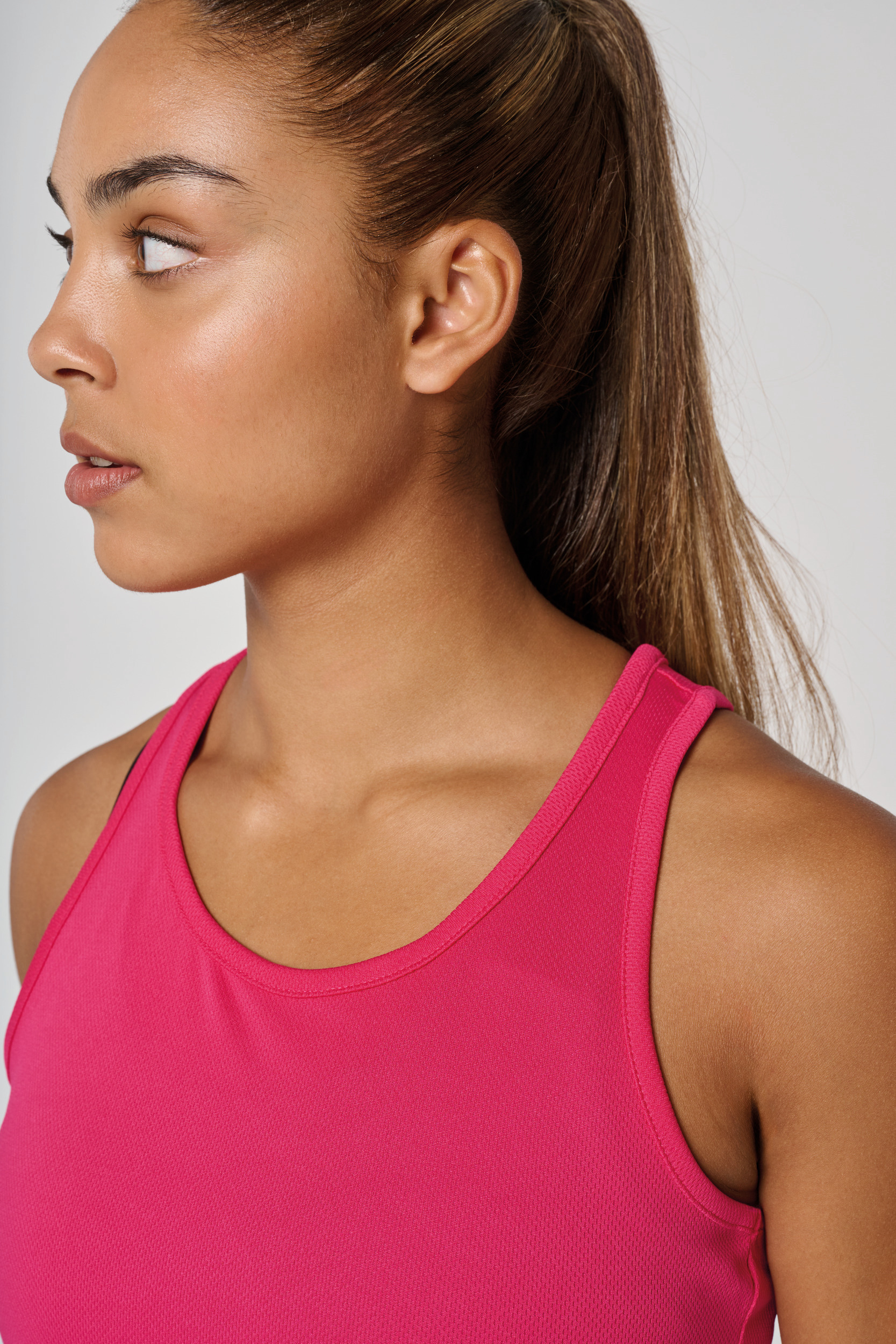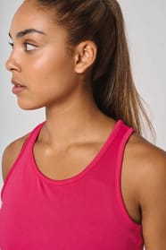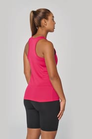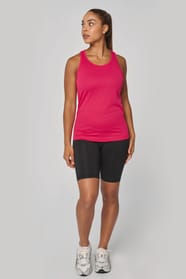 100% Poliestere. Tessuto leggero ad asciugatura rapida. Bretelle all'americana. Bordino al collo e al giromanica. Cuciture a doppio ago.